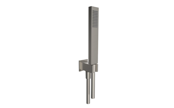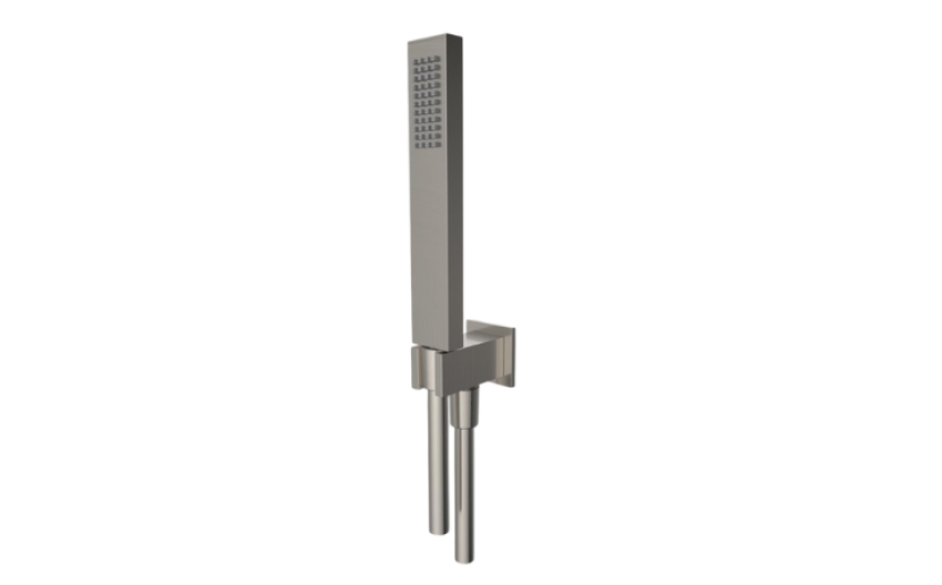 Il kit doccia quadro Elliot di Lara, realizzato in ottone con finitura brushed, include una doccetta e un flessibile da 150 cm in PVC silver con doppio cono antitorsione, combinando resistenza, stile e praticità per arricchire il tuo bagno.