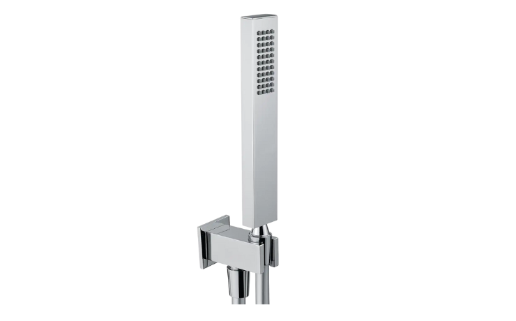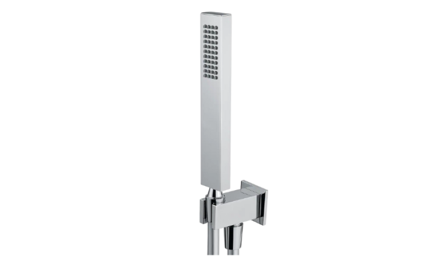 Il kit doccia quadro Elliot di Lara, in ottone con finitura cromo lucido, comprende una doccetta e un flessibile di 150 cm in PVC silver con doppio cono antitorsione, assicurando resistenza, eleganza e funzionalità per il tuo bagno.