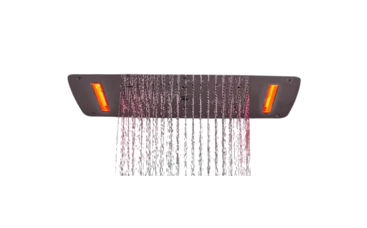 Il soffione quadro Spa, con finitura cromo lucido, è arricchito da un sistema di cromoterapia che include 2 luci a LED multicolore, regolabili tramite telecomando per un'esperienza di doccia unica e rilassante.