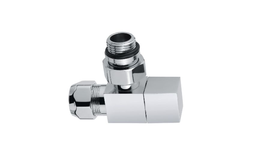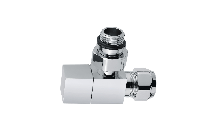 La coppia di valvole a squadra Cube di Lara, in finitura cromo lucido, realizzate con materiali resistenti e durevoli, garantisce prestazioni ottimali nel tempo. Con attacchi 1/2” 24/19 e raccordo multistrato da ø 16, assicura una connessione sicura e stabile.